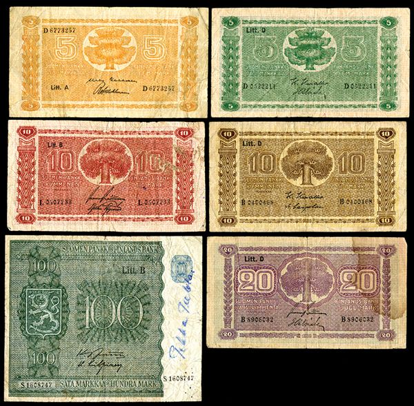 Finlands Bank, 1939-45, Lot of 6 Issued Banknotes Finland, lot of 6 World War II era notes, includes 5, 10, and 20 Markkaa dated 1939 (P-69, P-70, P-71); as well as 5, 10, and 100 Markka dated 1945 (P-76, P-77, P-80). All F-VF.