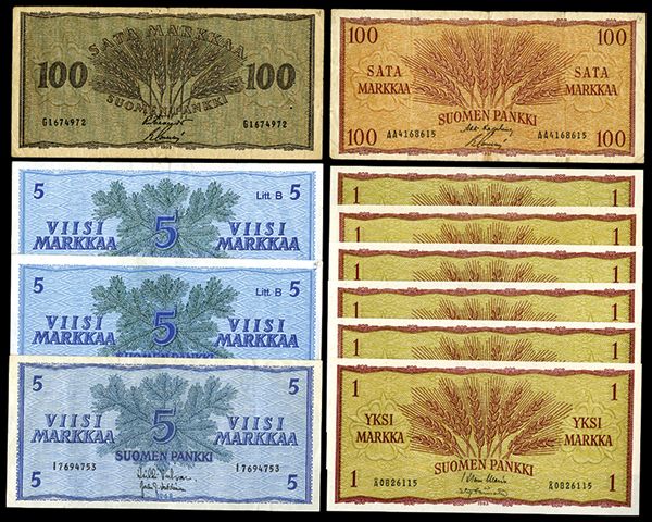 Finlands Bank, 1955-63, Lot of 11 Issued Banknotes Finland, lot of 11, includes 100 Markkaa, 1955, P-91; 10 Markka, 1957, P-97; 1 Markka, 1963, P-98, UNC (6 pcs, diff. sig. varieties); 5 Markka, 1963, P-99; and 5 Markka, 1963, P-106A. Average VF unless stated otherwise.