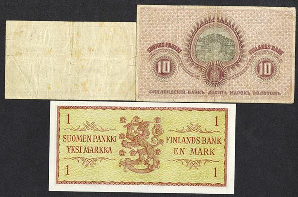 Finland. 1, 10 Mark. P-16, 25, 98. Two nice early notes, the third nice and modern. VF to AU. 3 pieces.
