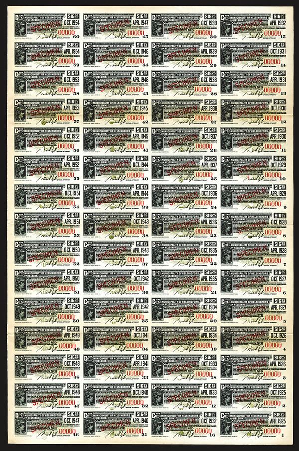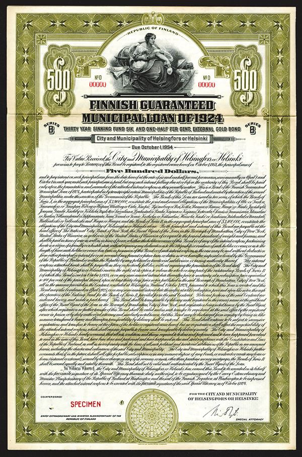 Finland. $500 Gold Coupon Bond Specimen. ABNC. VF+