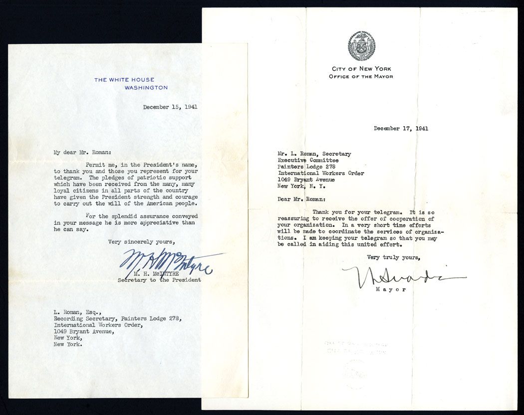 Lot of 2 letters, includes December 15, 1941 letter thanking Mr. Roman for his pledge of patriotic support, signed by M.H. McIntyre, Secretary to the President and a December 17, 1941 letter signed my Mayor Fiorello LaGuardia thanking him for his pledge of patriotic support. Both are in VF condition.
