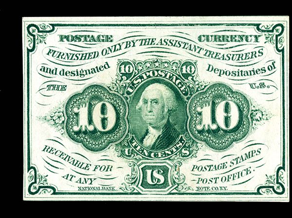 First Issue 10 Cent Fractional. Fr.1242. 10 Cent First Issue. Straight edges, with monogram. PMG MS 65 EPQ.