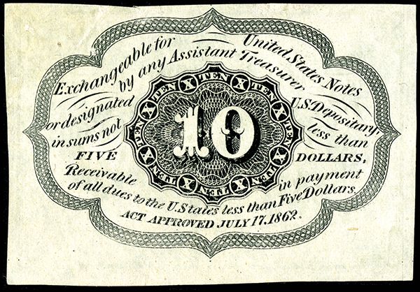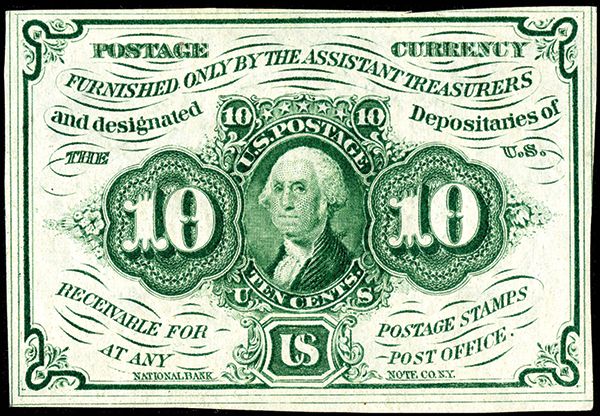 First Issue 10 Cent Fractional. Fr.1243. 10 Cent First Issue. Straight edges, without monogram. PMG AU 53. NET. Previously Mounted."