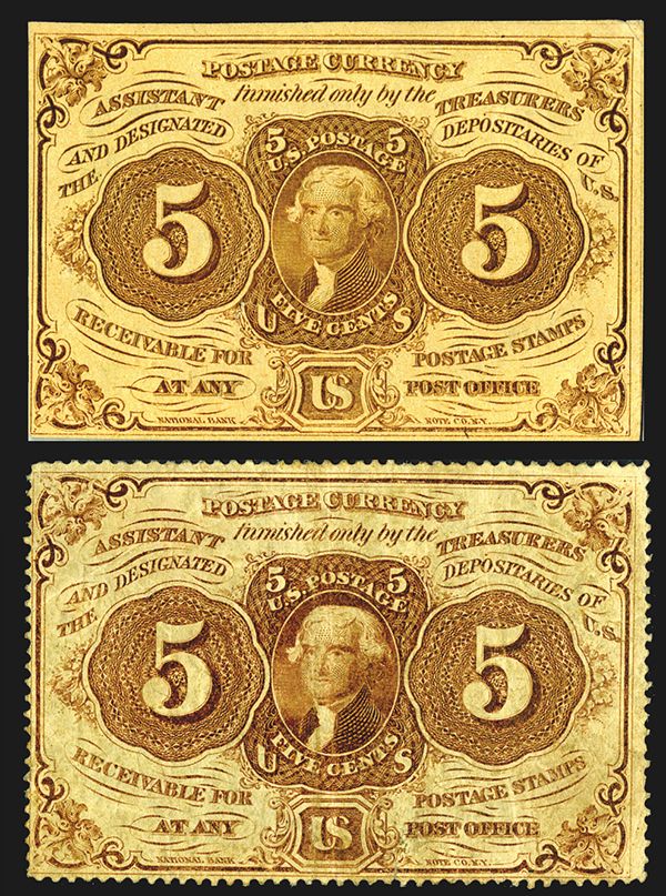 First Issue 5 Cent Fractional Pairing. 1) Fr.1229. Perforated edges. No monogram. PMG Very Fine 30. NET "Tear." 2) Fr.1230. Straight edges. With monogram. PNG Choice Unc. 63. NET. "Rust." [2]