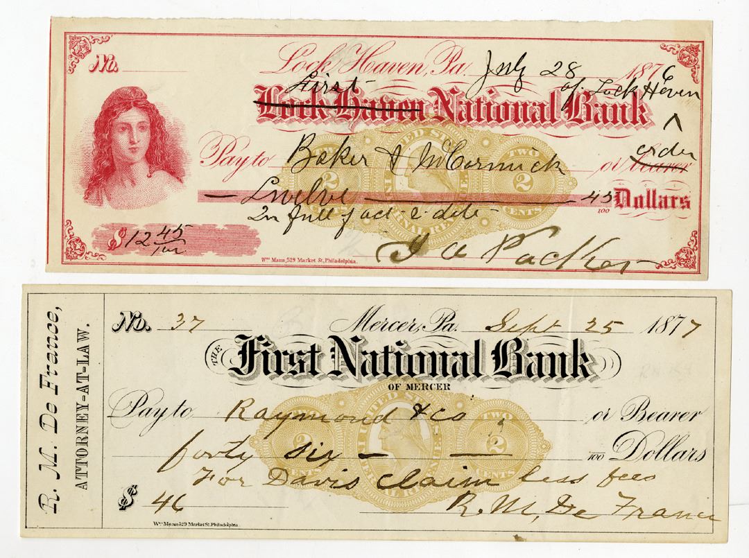 Pennsylvania, 1876-77. Lot of 2, I/U Bank Checks, Includes: Mercer, PA. 1877, First National Bank of Mercer; and, Lock Haven, PA, Lock Haven National Bank (name changed to First National Bank of Lock Haven). Both with olive Imprinted Revenue, RN-K11, Both in VF-XF condition. (2). Sold "AS IS" no returns accepted.