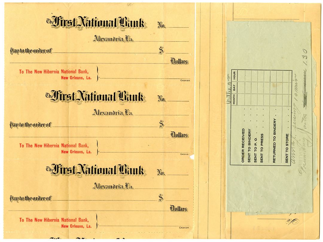 Alexandria, Louisiana, 1900s. Uncut Proof Check Trio, Black and red text. A fourth check has been cut off at bottom. Separate sheet includes information on lithograph printing on back. Fine to VF condition. Rare if not unique Louisiana draft.