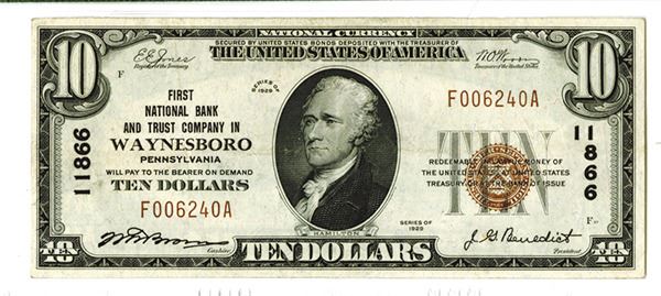 Waynesboro, PA. $10, Series of 1929, PMG graded Choice Very Fine 35, S/N F006240A.