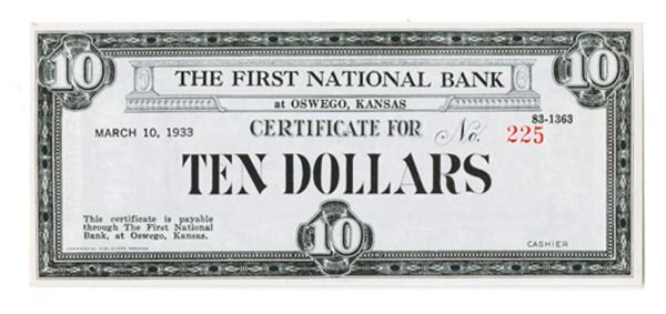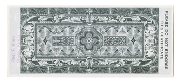 Kansas. 10 Dollars certificate. Low serial # 225. Light purple hand stamp endorsement of Rael F. Amos on back. Very Choice Uncirculated.