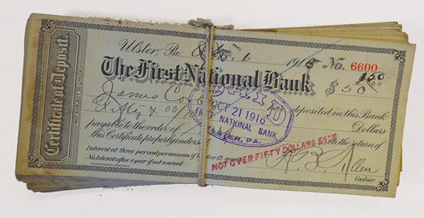 Ulster, Pennsylvania. 100 Bank Deposit Receipts, Black print on simple black border with purple "paid" stamp across each, Stewart, Warren & Co., Inc.