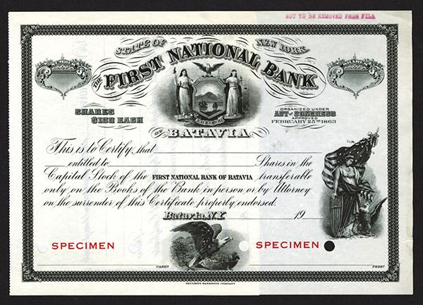 Batavia, NY. -Odd Shrs Stock Certificate. Specimen. Security BNC. VF+