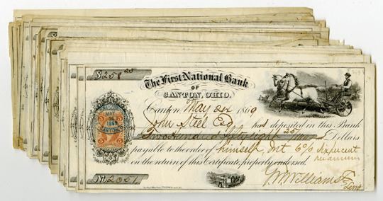Canton, Ohio, 1869-70. Assortment of over 30 issued checks from the First National Bank of Canton, Ohio. Most have black text with a man driving a pair of horses at top right corner with an ornate seal at left; 8 are with black text, with a large bank building depicted at left. All have adhesive internal revenue stamps. Fine condition. (30+)