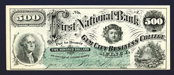 Quincy, Illinois. 1873. $500, black on light green underprint, Washington on left and young girl in middle, beehive on lower right, with ornate title, back green with information on college. No serial numbers. AU to Uncirculated condition. Scarce and attractive college currency note.