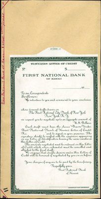 Hawaii19--, (ca.1910-1930). Proof Travelers Letter of Credit. Printed on india paper in green and mounted on manila card. Unique in archive. Rare Hawaii item. ABNC.