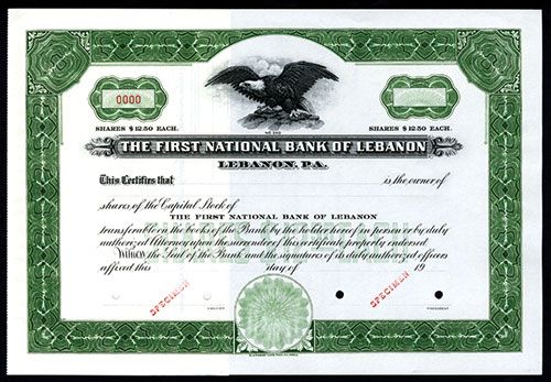 Pennsylvania, 19xx, Specimen Stock, Odd Shares, Black print on green border and underprint, Bald eagle top center, Red specimen stamp POC's and red s/n “ 0000” , VF-XF condition, E.A.WBNC.