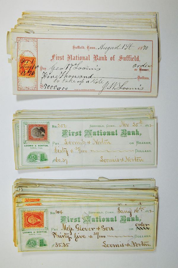 CT. Includes four different forms, all with revenue stamps attached. 1870-1876. Issued by the firm of Loomis & Norton. Signed and cancelled. 170 pieces.