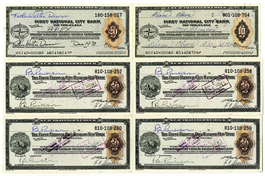 New York, 1972. Lot of 6 I/C Travelers Checks made out to various institutions, including: McDonalds; APEX; and Bank of India. All are VF-XF condition. (6). Sold "AS IS" no returns accepted.