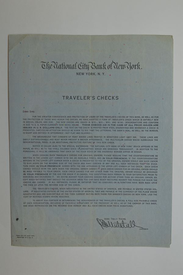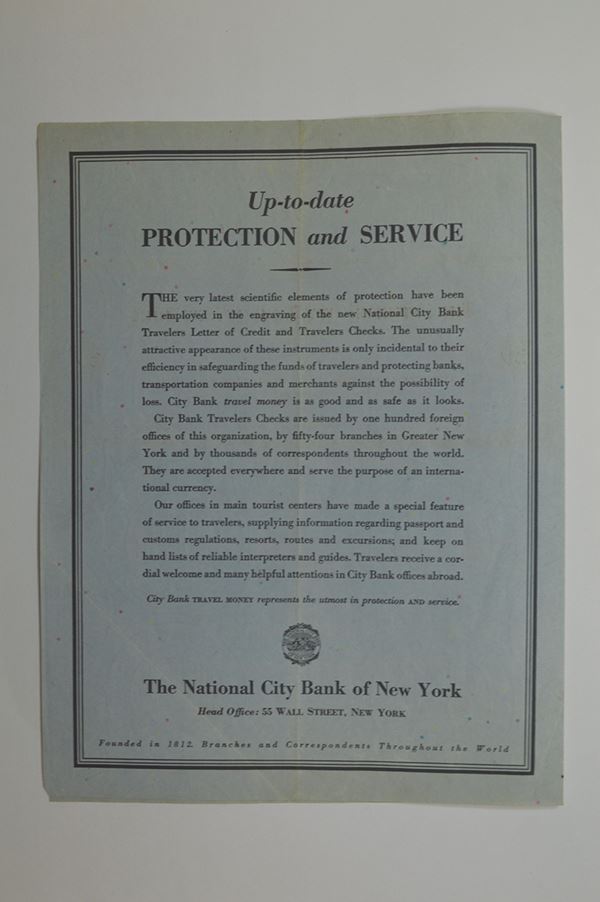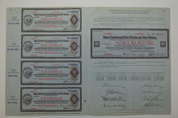New York. First National City Bank of New York (1931). Four page brochure on watermarked paper including images of $10, 20, 50 and 100 notes in intaglio, with information on the 6 signature combinations and serial # ranges available prior to 1931. Brochure has been folded vertically as well as several smaller folds.