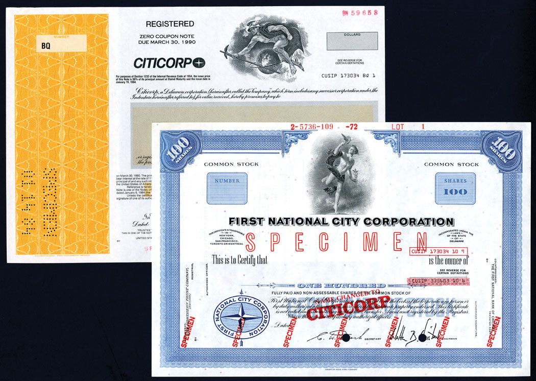 Lot of 2 specimen certificates, FNCC, 100 Shares and Citicorp, $-Odd, both in XF condition. The FNCC is scarce. ABNC & SC-USBN.