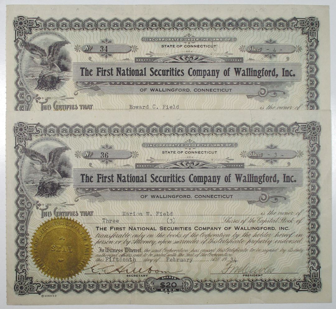 Connecticut, 1934. 2 pieces: 4 Shares I/U Capital Stock Certificate, S/N 34; and 3 Shares I/U Capital Stock Certificate, S/N 36. Both the same, Black text with black border, Eagle on rock at top left corner. Fine condition with some slight splitting along vertical fold lines. (John E. Herzog Collection) (2)
