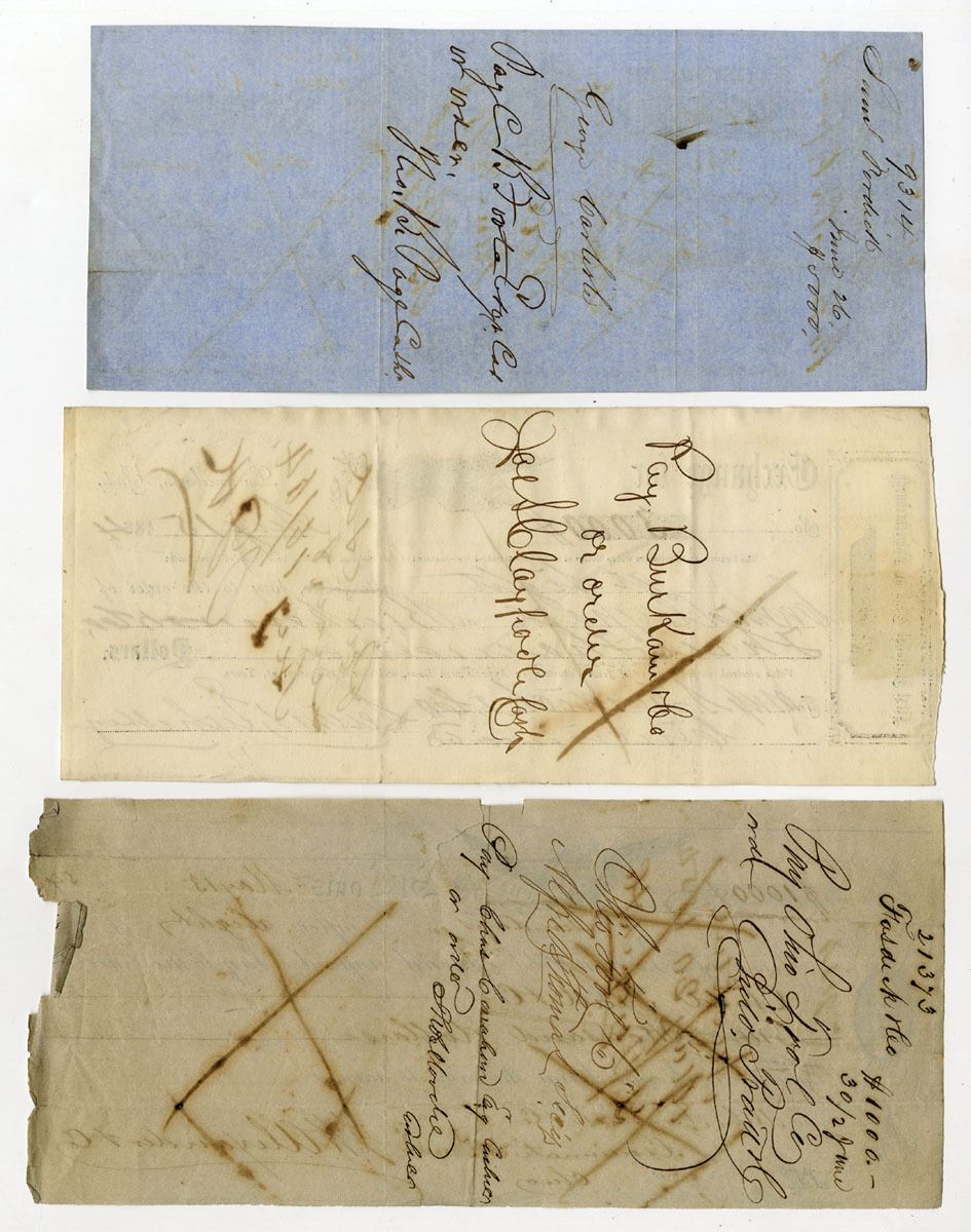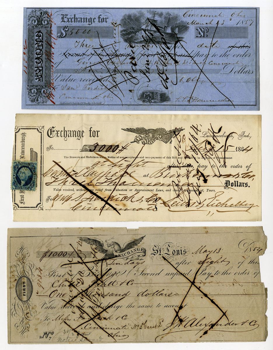 First of Exchange Trio of Cancelled Certificates for different denominations, 1854 to 1864. 1 Check has 2 Cent revenue stamp, (3).
