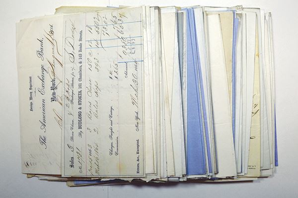 New York State Banking correspondence. From the Obsolete and early National Bank Note era, transmittal letters to and from banks, merchants and banking houses regarding collection on their notes or invoices. A variety of paper sizes, many letterheads. Banks include: Albany City Bank, Horbut Bank, Bank of Central NY, Canajoharie Bank, Metropolitan Bank, American Exchange Bank, City Bank (Chicago), Salt Springs Bank, Susquehanna Valley Bank, Bank of the Capitol, Highland Bank, Chemung Canal Bank, Grouse Bank, Ontario Bank, and others. Most folded, some with slight stains or old paper loss at one fold. Overall nice Very Fine or better. 100 pieces.
