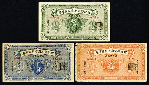 China, Lot of 3 notes, Includes 1/2 Yuan, P-626, S/M#T185-1-, Blue, AU with a pin hole on the lower right; 1 Yuan, P-627, S/M#T185-01-, Orange, Fine with a hinge remnant on the back; and 5 Yuan, P-628, S/M#T185-11-, Green, AU. Attractive trio of note. BEPP.