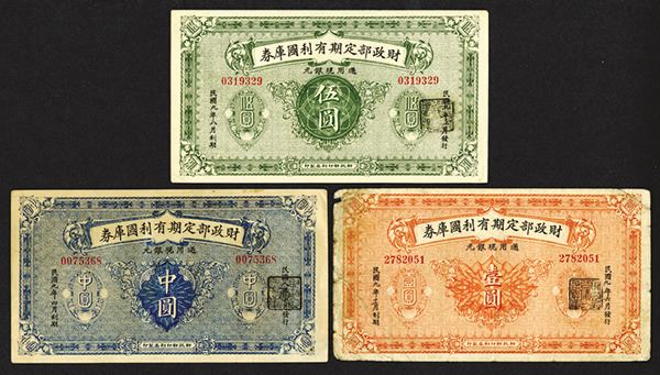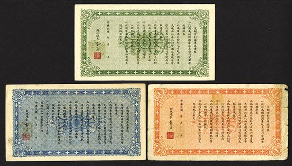 China, Lot of 3 notes, Includes 1/2 Yuan, P-626, S/M#T185-1-, Blue, AU with a pin hole on the lower right; 1 Yuan, P-627, S/M#T185-01-, Orange, Fine with a hinge remnant on the back; and 5 Yuan, P-628, S/M#T185-11-, Green, AU. Attractive trio of note. BEPP.