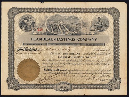 Arizona, 1906, 1000 Shares, Issued Stock, Black on brown border and underprint, Vignette top center of gold mine operation with vignette of men mining for gold on left and men panning for gold right, VF-XF condition.