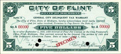 1934. $1; $5 "General City Delinquent Tax Warrant". 2 different specimen banknotes. Red specimen overprints, POC's and "00000" serial numbers. Both faces are green with arrow head outline vignette on the left and right of the denomination and backs are orange. Choice Unc. Rare set. ABNC.