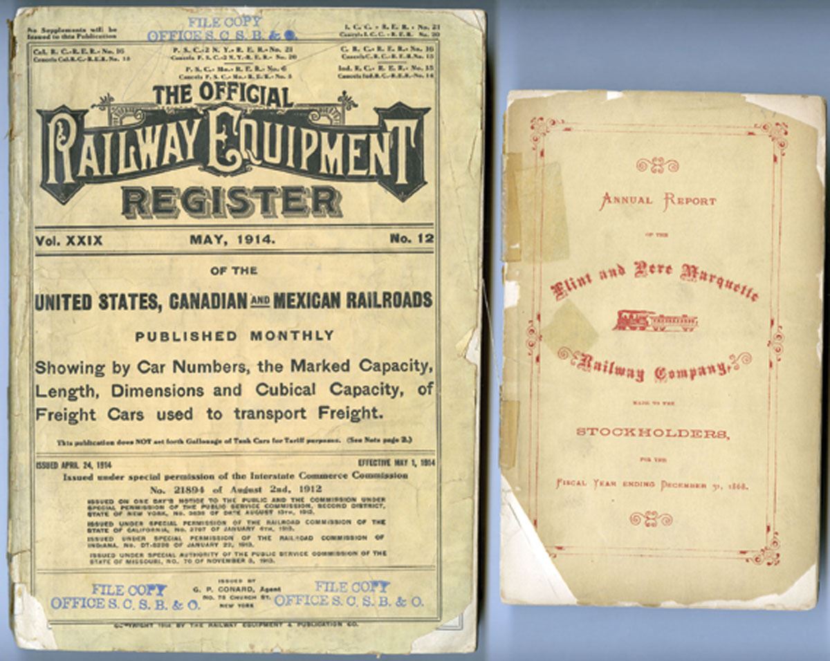 Lot of 2 books. Includes 1868 Flint and Pere Marquette Railway Company Annual Report, the front cover is slightly damaged and repaired and a 1914 Railway Equipment Register. It includes some small maps and ads and 1120 dense pages of everything you would ever want to know about literally hundreds of railroads and what they are composed of. Scarce railroad related items for the serious collector.