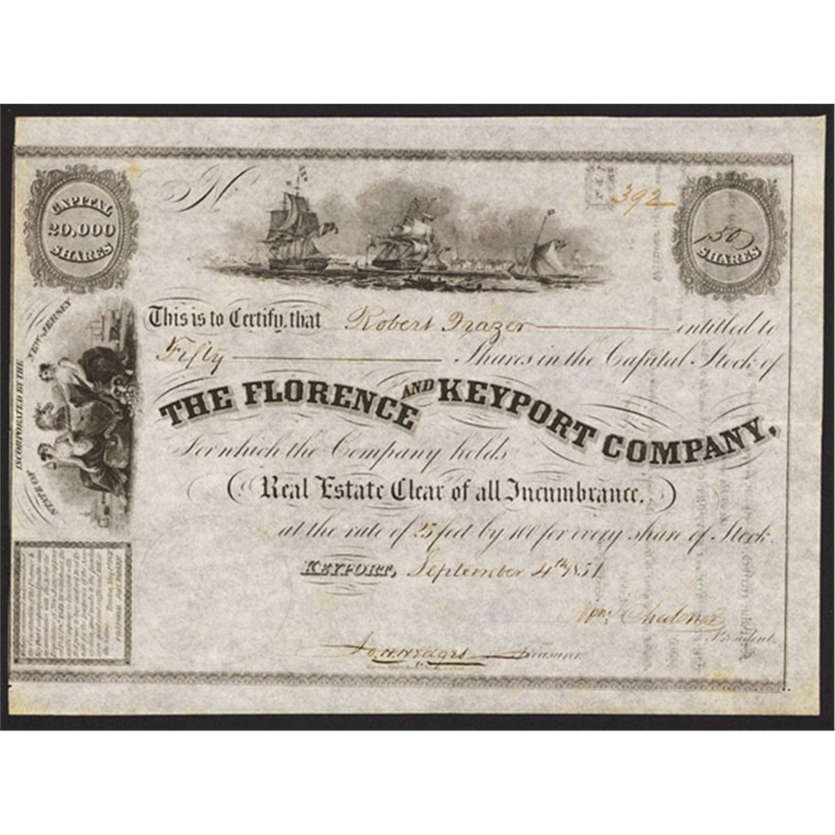 Keyport, New Jersey, 1851, 50 Shs, Issued stock, Ships center, State arms left, Rawdon, Wright, Hatch & Edson, XF.
