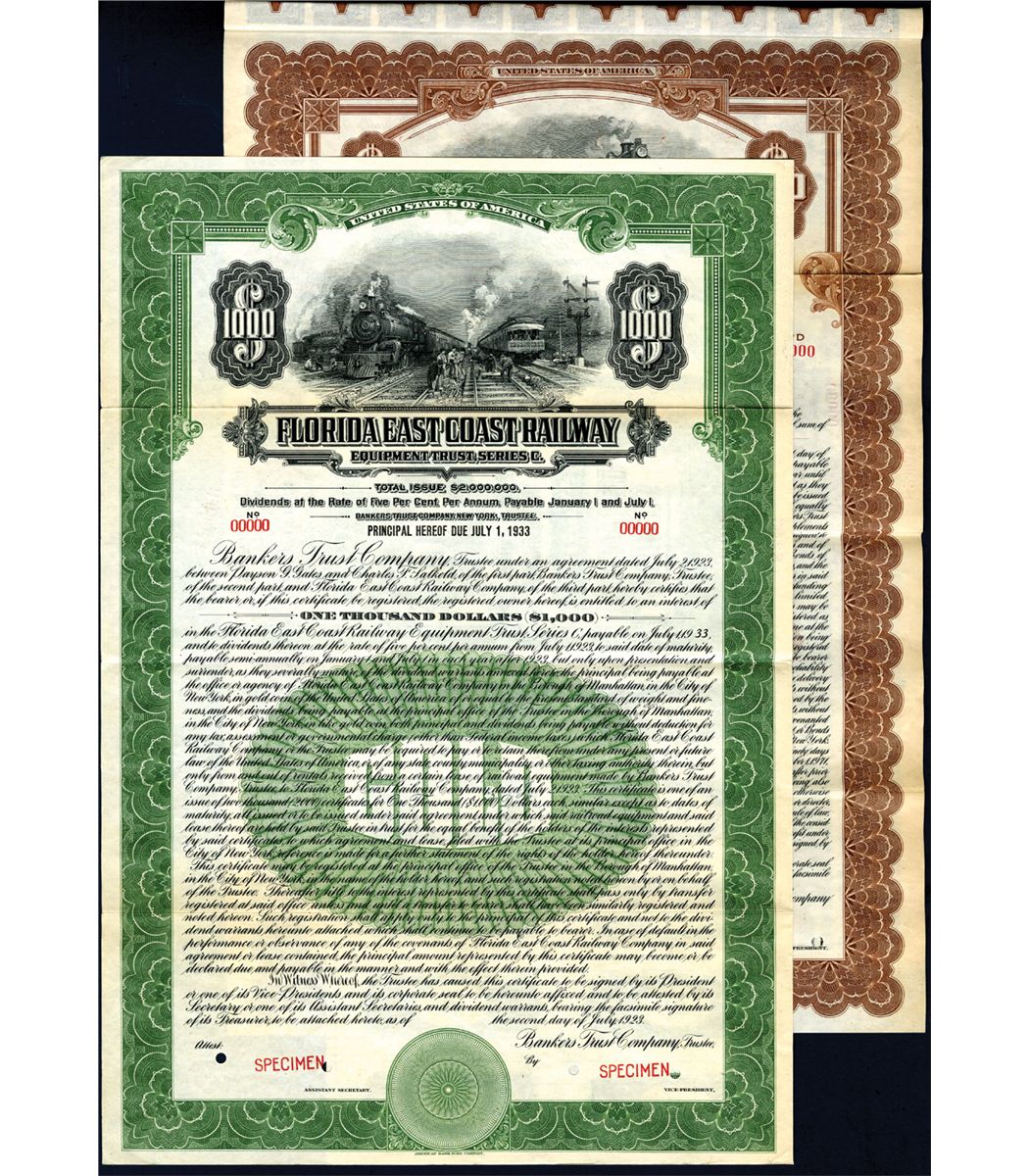 Florida. Lot of 2 bonds, includes 1923, $1000 Equipment Trust Series C, 5% Specimen Gold Bond, green border and underprint and 1924, $1000 1st & Refunding Mortgage 5% Series A Specimen Gold Bond, brown border and underprint, two different vignettes of Locomotives passing railway workers top center. POC's, XF condition. ABNC. Listed railroad but unlisted bond series and dates than listed in Cox.