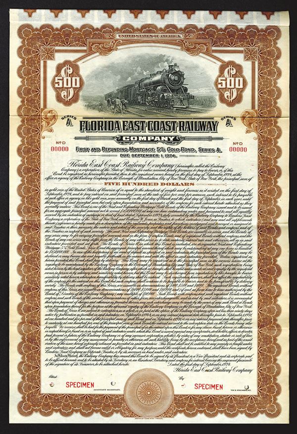 Florida, 1924, $500 1st and Refunding Mortgage 5% Series A Gold Specimen Bond, Black printing with brown border and underprint, Moving locomotive top center, POC's and red SPECIMEN overprints, VF condition, ABNC. Specimen only issue in Cox. Rare and attractive.