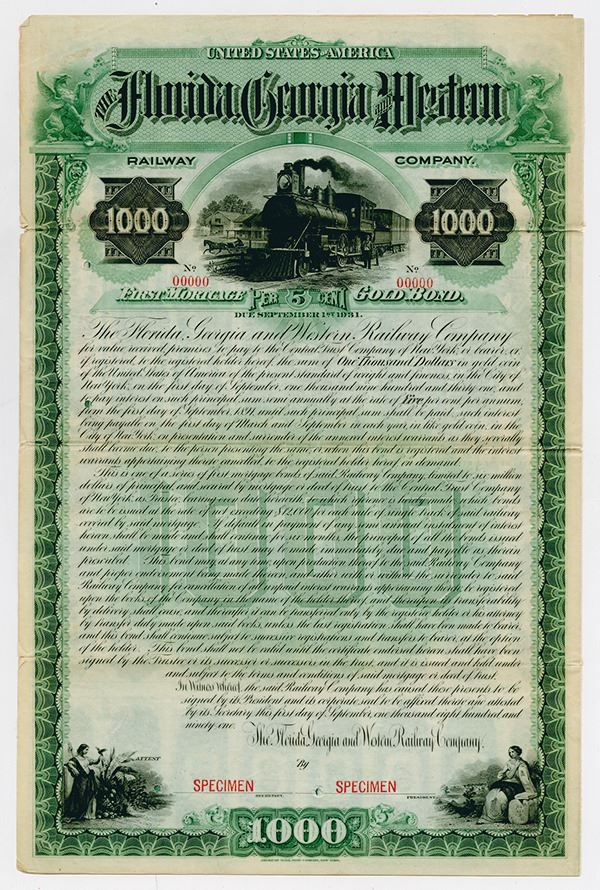 Florida; Georgia. $1,000, bond, man beside loco r-l in yard, horse and buggy beyond, vertical format, 1st mortgage, bearer gold coupon, 5%, 50-yr, 1881, due 1931, by ABN.