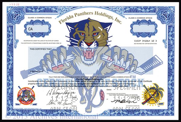 Florida Panthers Holdings, Inc., 1996 Specimen Stock Certificate. Florida. Odd Shares, Class A Common Stock, Pin punch "Specimen - 11-12-96". Blue border with large full certificate sized colorful panther holding a broken hockey stick with the Panther logo on lower left and corporate seal with hockey stick and palm tree. Choice uncirculated. Popular and colorful ice hockey stock certificate. XF.