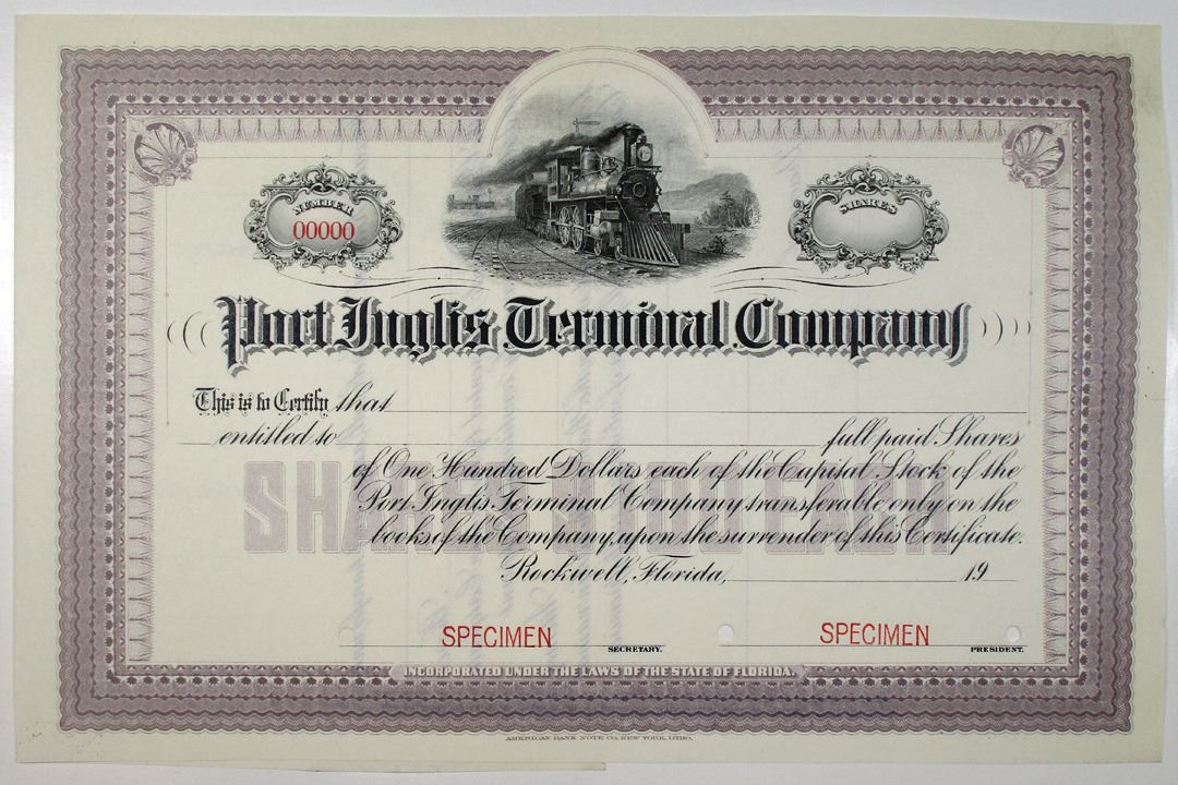 Rockwell, Florida, 1904. Odd Shares Specimen Capital Stock Certificate, Black text with purple border and underprint, Train approaching on tracks at top center. Red specimen overprints, 00000 serial number, and POCs. VF condition, ABNC. Rare and only known as a specimen in Cox, no issued examples known.