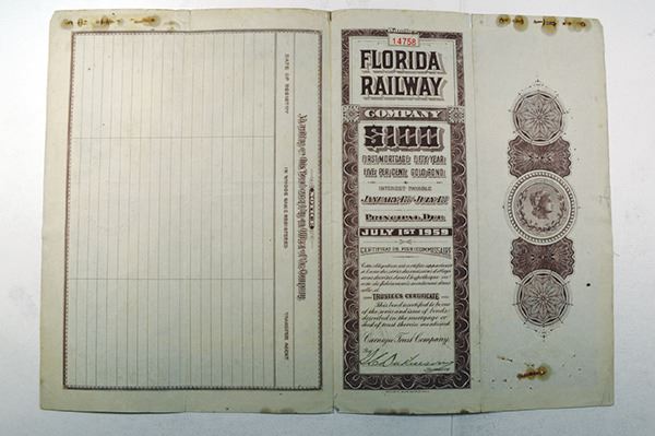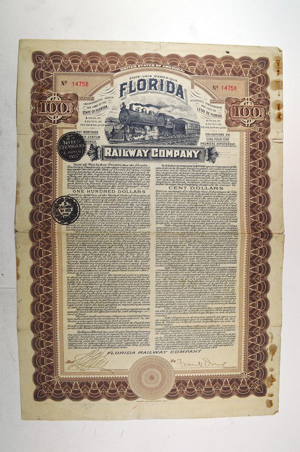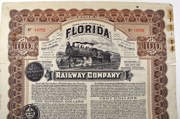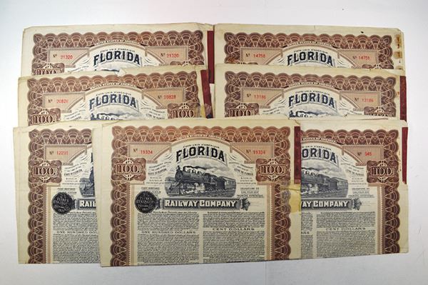 FL. $100 Coupon Bonds issued in France. Steam locomotive at top center, Edges are rough some adhesive tape present on coupons. Fine. 7 pieces.