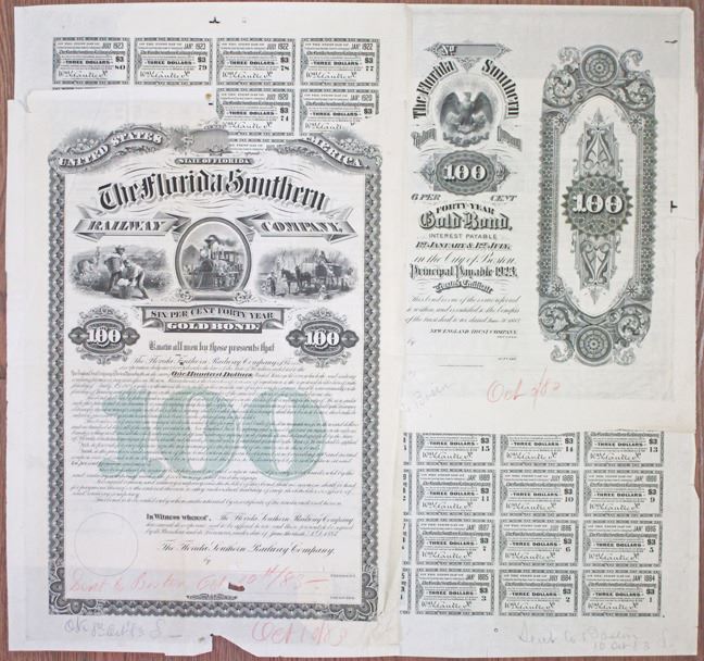 Florida. 1883. Lot of 4 items, Includes $100, 6% 40 Year Gold Coupon Bond Proof face, Back Panel Proof and 2 coupon front sheets, all printed in black on india paper. Locomotive in middle flanked by slaves carrying cotton on left and stacking sugar cane on cart on right, large light green "100" in middle with black border and text. Rare proof bond and possibly the only format it is collectible. Appears VF but it is missing a 5 inch by 2.5 inch piece on the top right border, still possibly unique in this format as an approval proof and will be impossible to improve upon. ABNC.