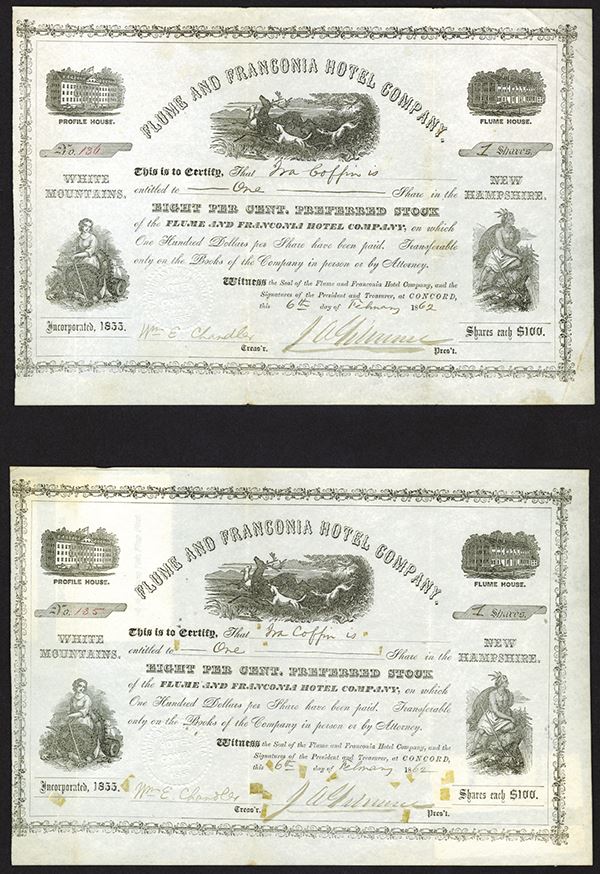 Concord, New Hampshire, Lot of 2 certificates, both with same design and for 1 Share each, Deer being chased by hounds on top, Native America on right and allegorical woman on left with images of the hotels on top left and right, both in Fine to VF condition and rare.