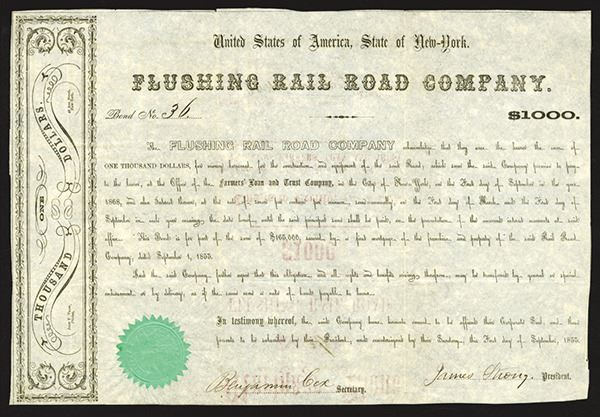 New York, $1000, 7% Bond, No vignette, ornate counterfoil at left, printed on thin paper, S/N 36, Fine to VF but possibly cut down to margins. Scarce railroad.