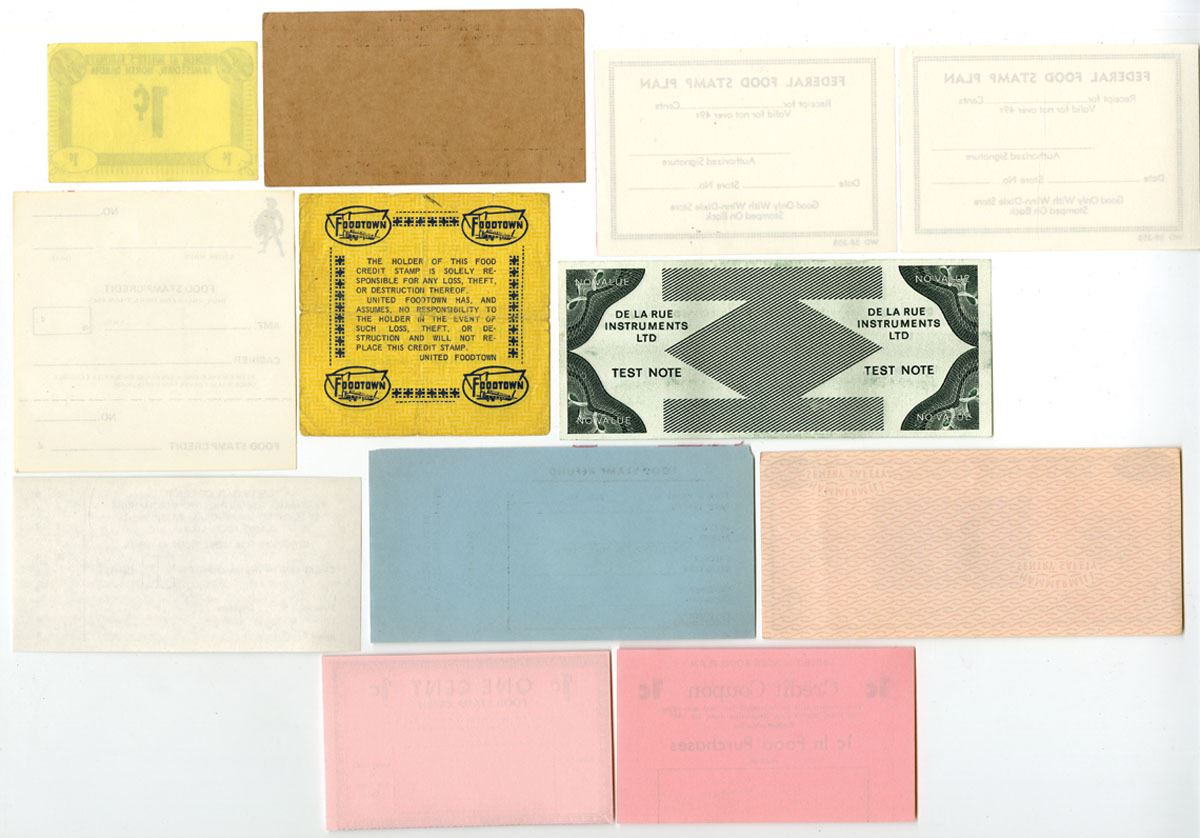 Lot of 12 Food Stamps and Ration Cards from the Great Depression and World War II, Cards is are various sizes and colors and represent various federal and local rationing and food credit programs, Conditions range from Fine to About Uncirculated overall, with some showing light handling or staple marks typical of use. (12). Sold ‘AS IS’ no returns accepted.
