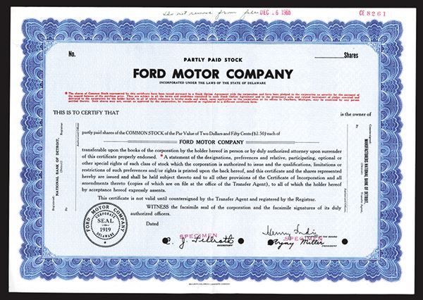 Odd Shares, Black on blue border with red overprint, Dated 1965 on top, rare variety for this company with only 3 found in the archives. VF, SCBNC.