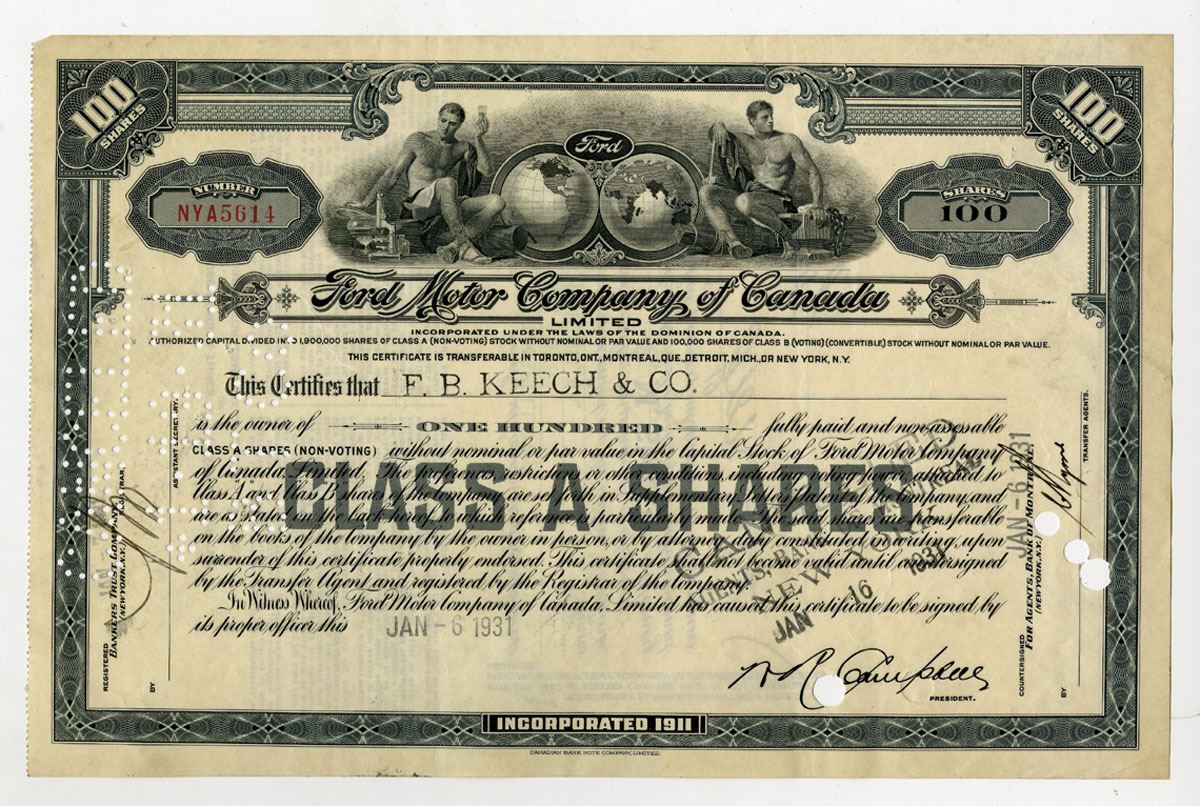 Canada, 1931. 100 Shares Class A Non Voting Capital Stock I/C Certificate, Black printing with a blue border and underprint, allegorical figures flanking hemispheres of the globe, Hole punched and stamped canceled, XF condition, Canadian BNC.