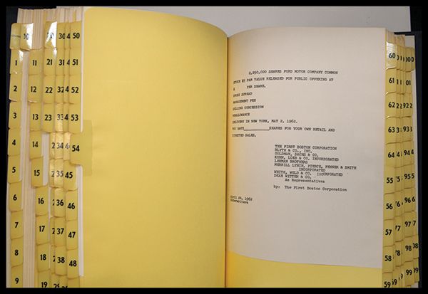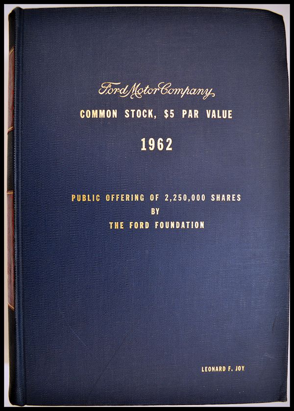 Ford Motor Company Prospectus. Red and green bound book containing 110 items relating to the public offering of 2,250,000 shares of common stock by the Ford Foundation in 1962. Nice condition.