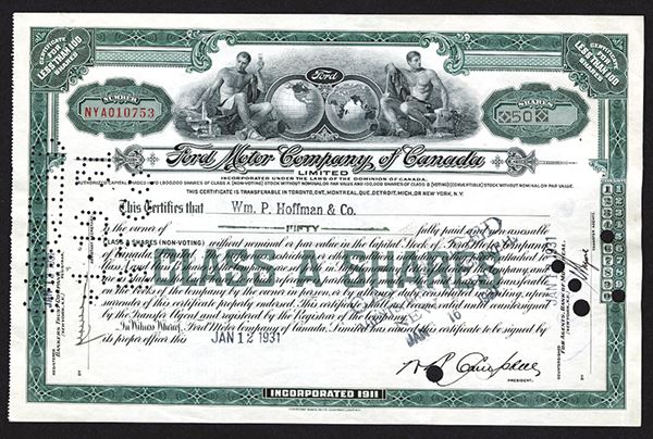 Canada. 50 Class A shares, green frame, two globes flanked by semi-nude men, CBNC, EF. Incorporated in 1911 when Henry Ford saw the tax advantages of manufacturing in Canada.