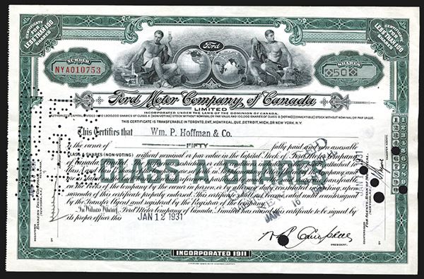 Canada. 50 Class A shares, green frame, two globes flanked by semi-nude men, CBNC, EF. Incorporated in 1911 when Henry Ford saw the tax advantages of manufacturing in Canada.