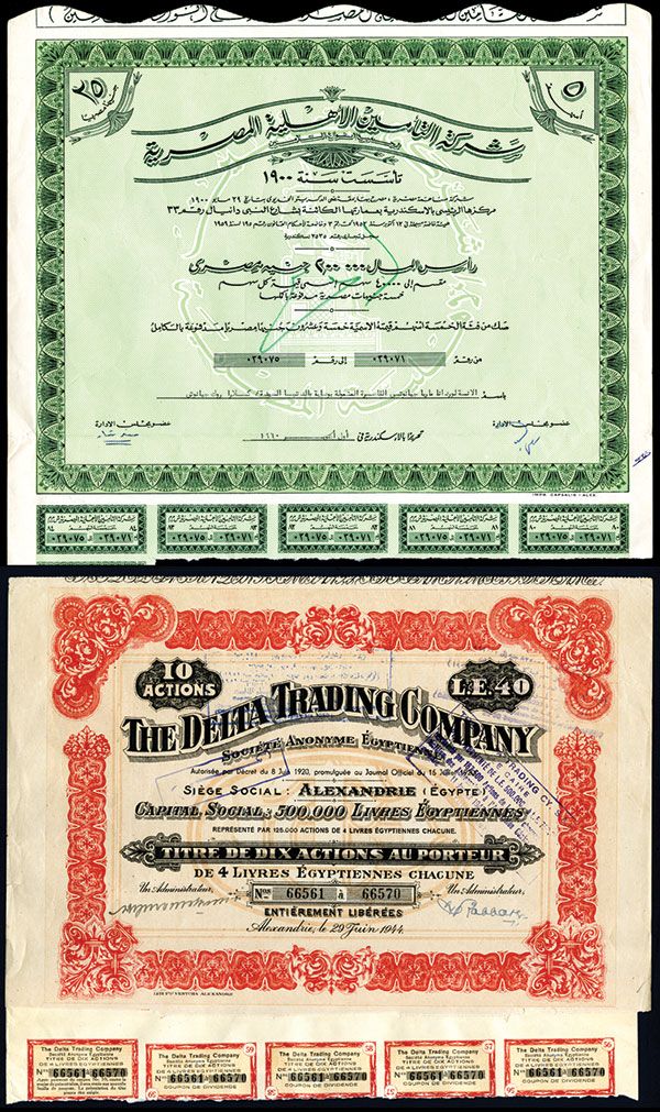 Lot of 3 pieces, Includes Italy, Societa Della Ferrovia Sicula Occidentale Palermo - Marsala - Trapani, 500 Lire, Remainder or Specimen; Egypt, Delta Trading Company, 1944 Issued; Egyptian bond all in Arabic. All are in VF to XF condition.