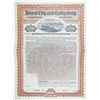 South Dakota, 1899. $1000 Specimen 4% First Mortgage Coupon Bond, Black text with brown border and undertint, Train cars on tracks with factory in distance at top center. Red specimen overprints, 00000 serial numbers, and POCs. VF condition, ABNC. Listed railroad, unlisted as a bond in Cox, only as a stock certificate. Only 2 examples found in the ABN Archives in 2002, this is the only example available.