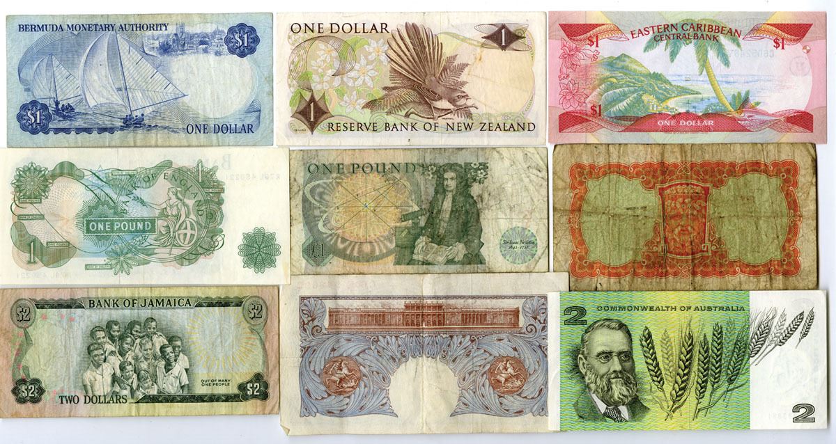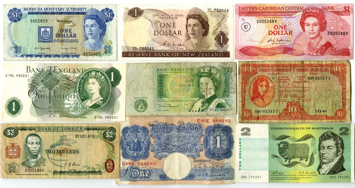 World Wide, 1940-82. Lot of 9 Issued Banknotes from Countries that are or used to be part of the United Kingdom, Includes notes from Jamaica, East Caribbean States, Ireland, England, New Zealand, Australia, and Bermuda. Notes range from Fine to XF condition. (9). Sold "AS IS" no returns accepted.