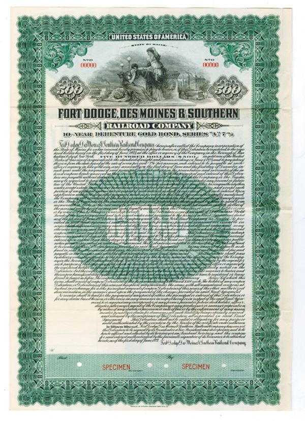 Iowa (Inc. in Maine). Specimen $500 10-Year Debenture Gold Bond Series A 7 %, green, woman, dynamo, streetcars, with coupons attached, Uncirculated, POC's, folded in thirds as made. Unlisted earlier Bond date and design in Cox.
